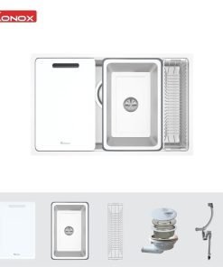 - Tích hợp phụ kiện thông minh: Thớt nhựa, rổ phụ, siphon, tặng thêm chậu rửa nhỏ