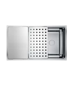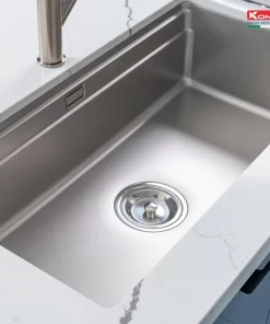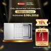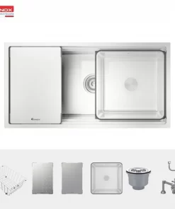 - Thiết kế hiện đại với gờ hạ bậc – tích hợp phụ kiện thông minh: Siphon, giá úp bát inox, chậu rửa nhỏ, thớt inox, thớt inox lỗ