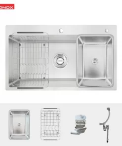 - Thiết kế hiện đại tích hợp phụ kiện thông minh: Siphon, giá úp bát inox