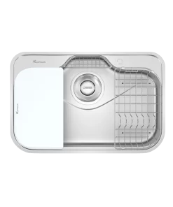 - Thiết kế hiện đại với gờ hạ bậc – tích hợp phụ kiện thông minh: Thớt nhựa, rổ úp bát, siphon