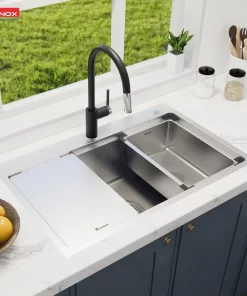 - Thiết kế hiện đại với gờ hạ bậc – tích hợp phụ kiện thông minh: Siphon, thớt inox, Colander