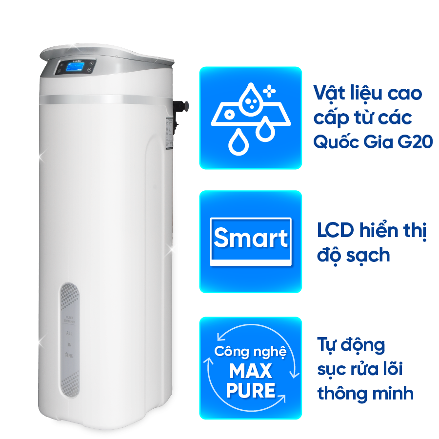 - Hệ cột lọc MAX PRO hiện đại nhất, với 2 cột lọc MAX CLEAN cùng cột làm mềm MAX SOFT loại bỏ tạp chất và mùi trong nước, trả lại nguồn nước sinh hoạt đạt tiêu chuẩn QCVN 01-1:2018/BYT