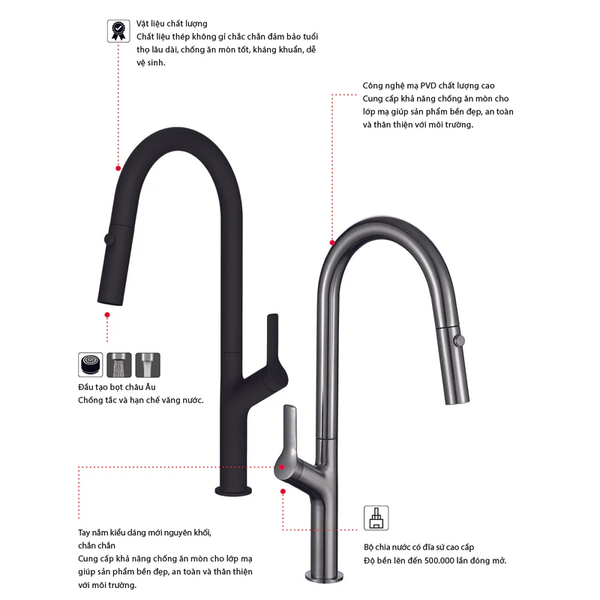 - Đầu vòi rửa có thể kéo dài 2 chức năng